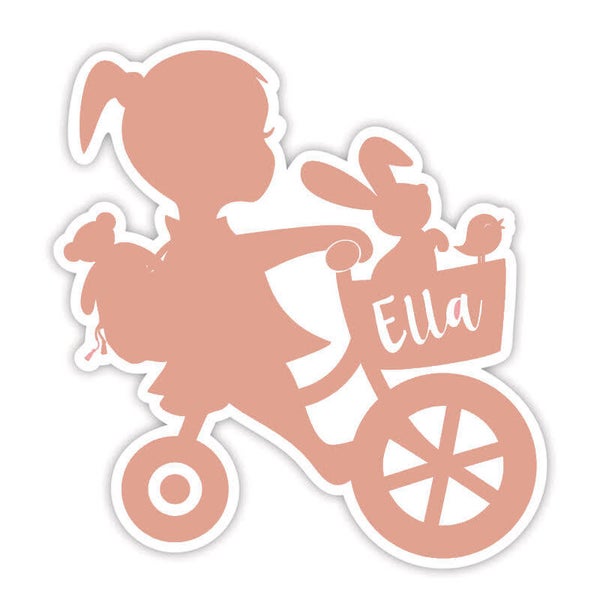 Dit schattige geboortebord toont een silhouet van een meisje op een fietsje, met een konijntje en een vogeltje in het mandje. Perfect voor in de tuin, op het balkon of op het raam als vrolijke geboorteaankondiging.