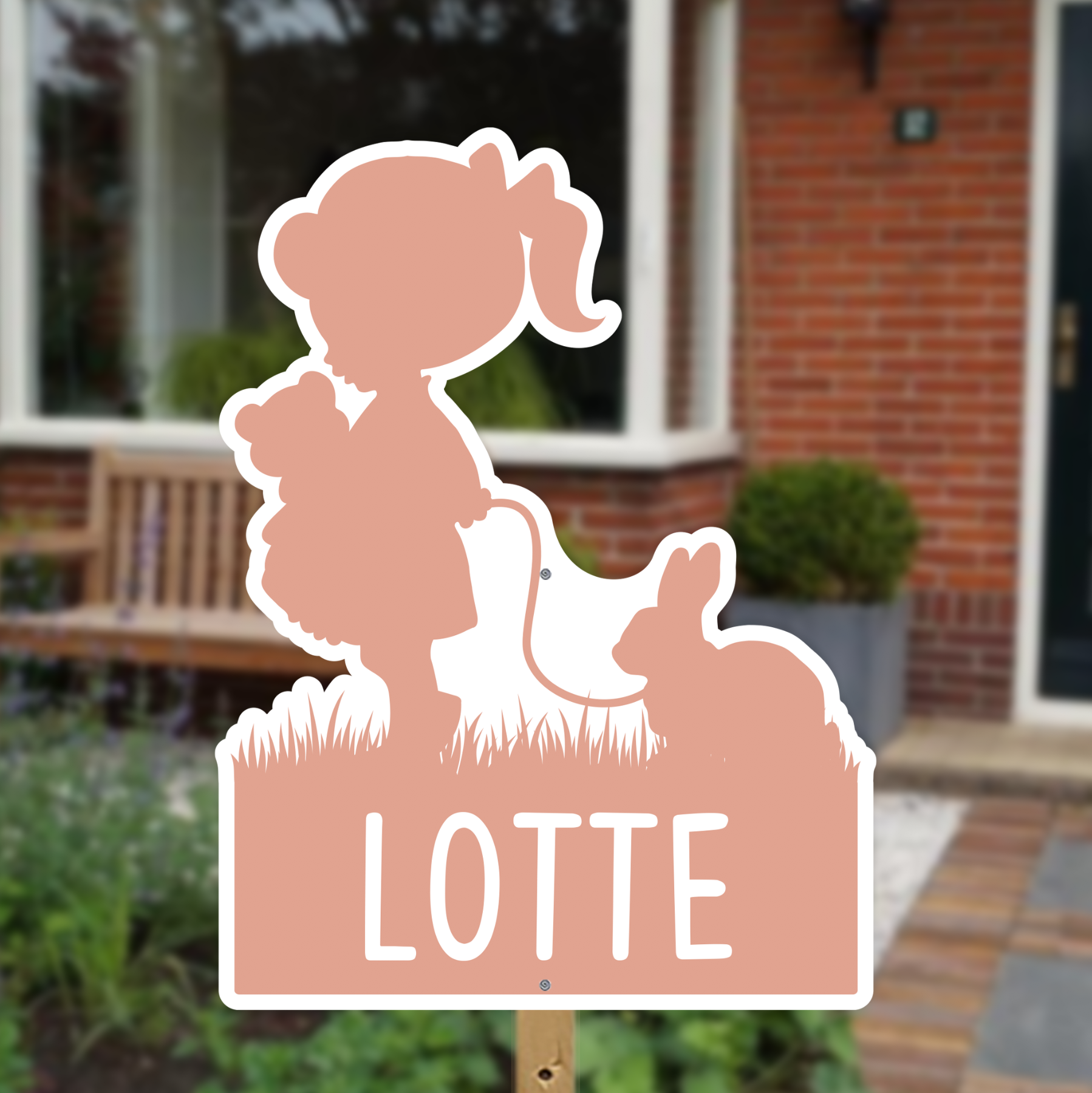 Geboortebord silhouette meisje dat wandelt met een aangelijnd konijntje en teddybeer. Speelse silhouette geboorteaankondiging voor tuin, balkon of raam; ook geschikt als raamsticker. Het silhouette ontwerp geeft een tijdloze, lieve uitstraling.