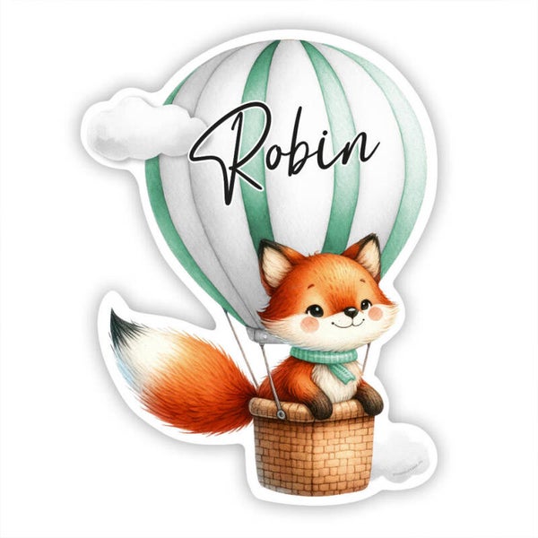 Geboortebord vosje in luchtballon, een lieve geboorteaankondiging voor in de tuin, op het balkon of op het raam.