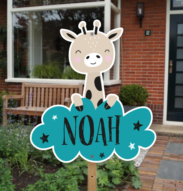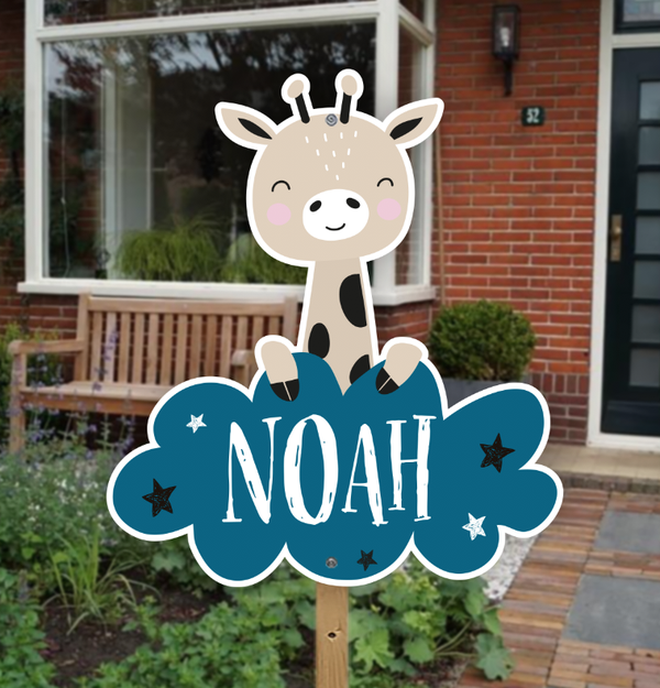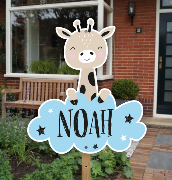 Geboortebord met een vrolijke giraffe die achter een wolkje vandaan piept. Een speelse en frisse geboorteaankondiging waarmee je duidelijk laat zien dat jullie zoontje is geboren. Geschikt voor in de tuin, op het balkon of op het raam.