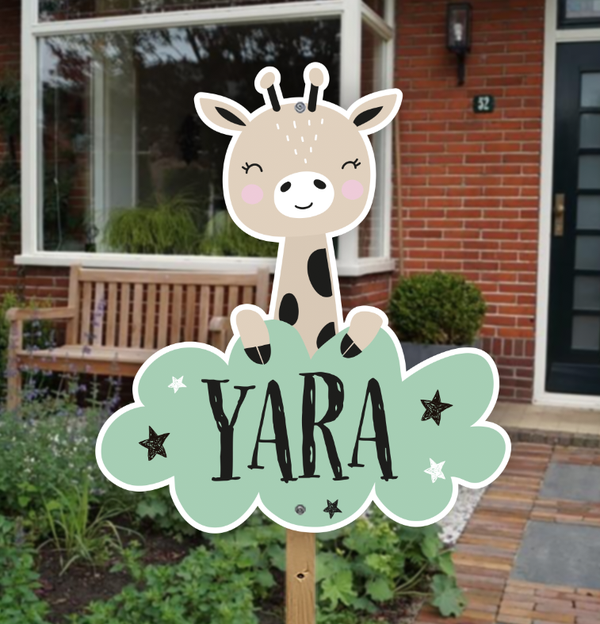 Geboortebord met een vrolijke giraffe die achter een wolkje vandaan piept. Een lieve en vrolijke geboorteaankondiging waarmee je de komst van jullie dochter op een opvallende manier viert. Geschikt voor tuin, balkon en raam.