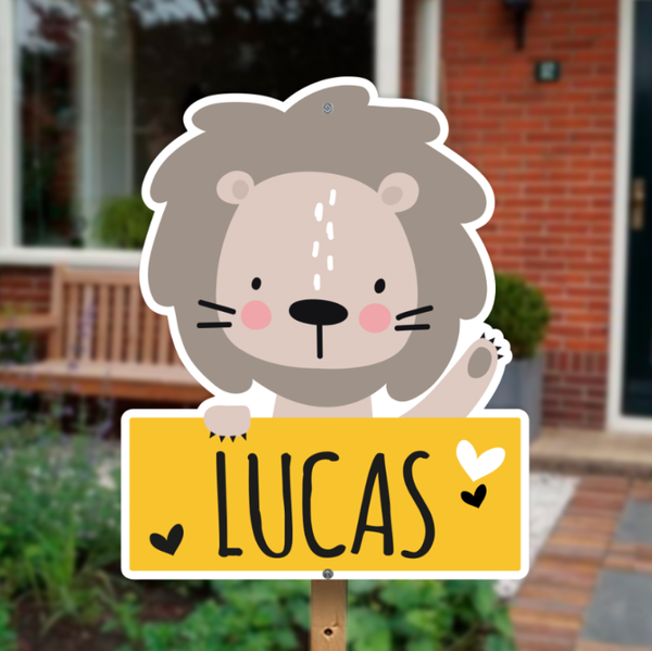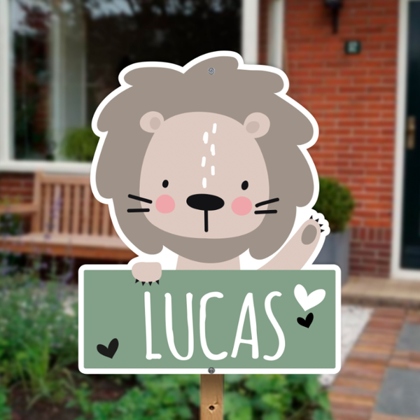 Geboortebord met een vrolijk leeuwtje dat een bordje vasthoudt. Een stoere en speelse geboorteaankondiging waarmee je duidelijk laat zien dat jullie zoontje is geboren. Geschikt voor in de tuin, op het balkon of op het raam.