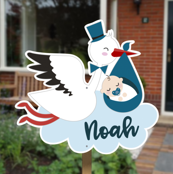 Geboortebord met een vrolijke ooievaar die een baby draagt en op een wolkje rust. Een speelse en klassieke geboorteaankondiging waarmee je duidelijk laat zien dat jullie zoontje is geboren. Geschikt voor tuin, balkon en raam.