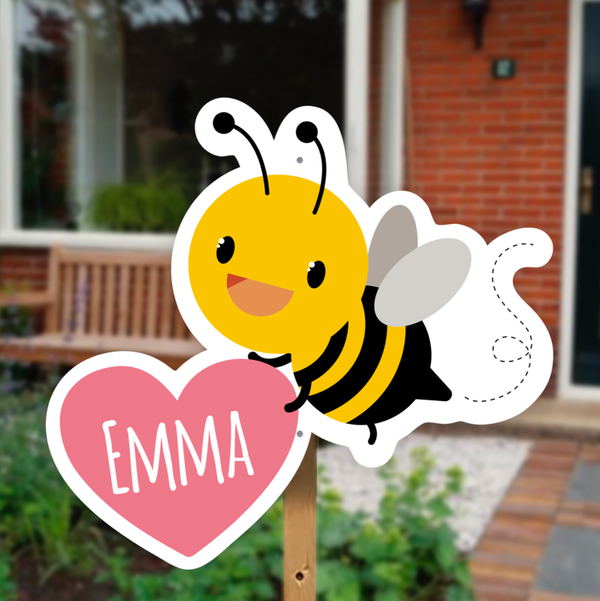 Geboortebord met een vrolijk bijtje dat een hartje vasthoudt. Een lieve en speelse geboorteaankondiging waarmee je de komst van jullie dochter viert. Geschikt voor tuin, balkon en raam.