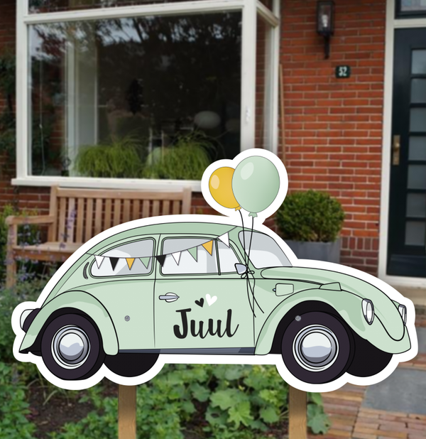 Geboortebord in de vorm van een klassieke kever-auto met slingers en ballonnen. Een stoere en feestelijke geboorteaankondiging waarmee je laat zien dat jullie zoontje is geboren. Geschikt voor tuin, balkon en raam.