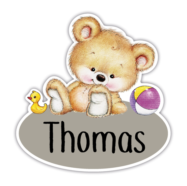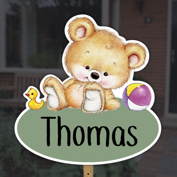 Geboortebord met een lief beertje dat speelt met een badeendje en bal. Een vrolijk geboortebord waarmee je op een speelse manier laat zien dat jullie zoontje is geboren. Geschikt voor tuin, balkon en raam.