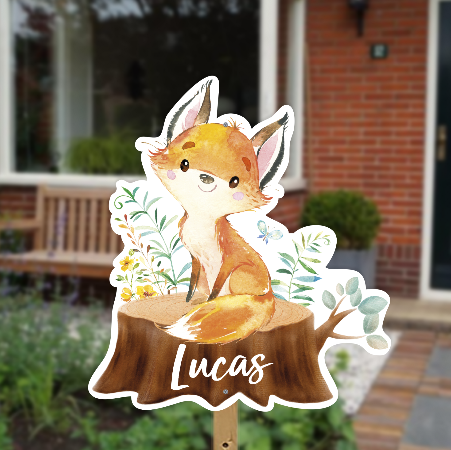 Een vrolijk geboortebord met een vosje dat op een boomstam zit tussen speelse blaadjes en bloemen. De natuurlijke aquarelstijl met frisse groentinten geeft het ontwerp een lieve, tijdloze uitstraling. Perfect om de geboorte van jullie zoon aan te kondigen in de tuin of bij het raam.