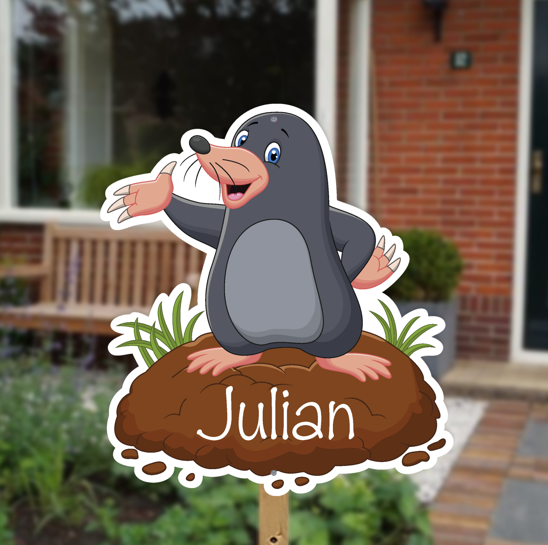 Een vrolijk geboortebord met een vriendelijke mol die enthousiast uit zijn molshoop tevoorschijn komt. De warme kleuren en speelse uitstraling maken dit ontwerp geschikt voor zowel een jongen als een meisje. Een uniek bord dat direct een glimlach oproept bij iedereen die voorbijloopt. Perfect voor in de tuin of bij het raam.