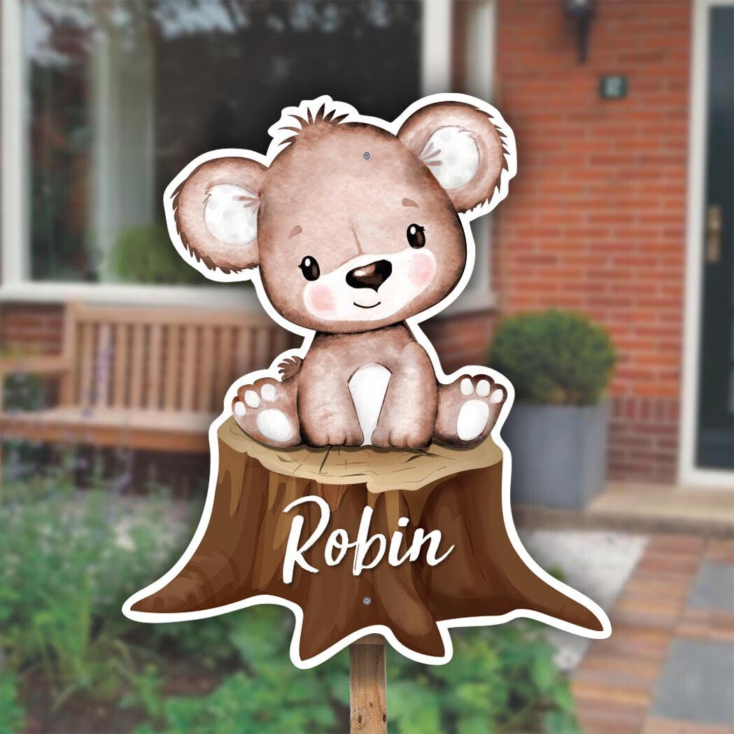 Een lief geboortebord met een schattig beertje dat op een boomstam zit. De zachte aquarelstijl en natuurlijke kleuren geven dit ontwerp een warme, rustige uitstraling. Perfect om de geboorte van jullie kindje aan te kondigen, geschikt voor zowel een jongen als een meisje.