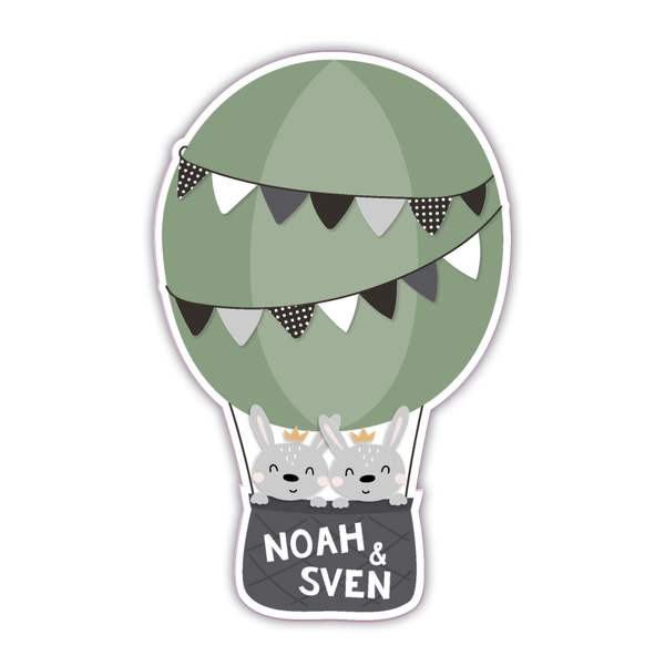 Twee schattige konijntjes zitten samen in een luchtballon – een vrolijk ontwerp dat perfect past bij de geboorte van een jongens tweeling
