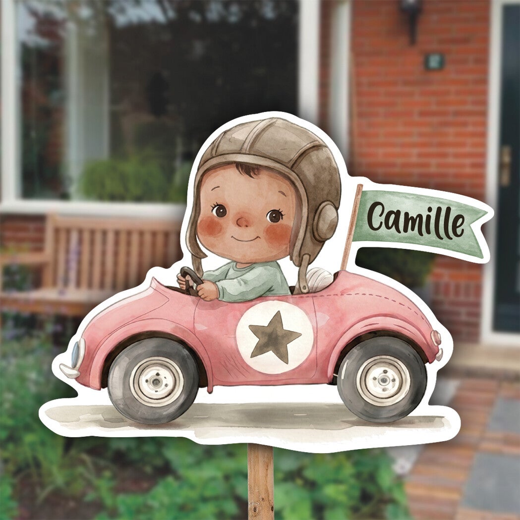 Geboortebord tuin | Baby raceauto | Getinte huidskleur | Meisje